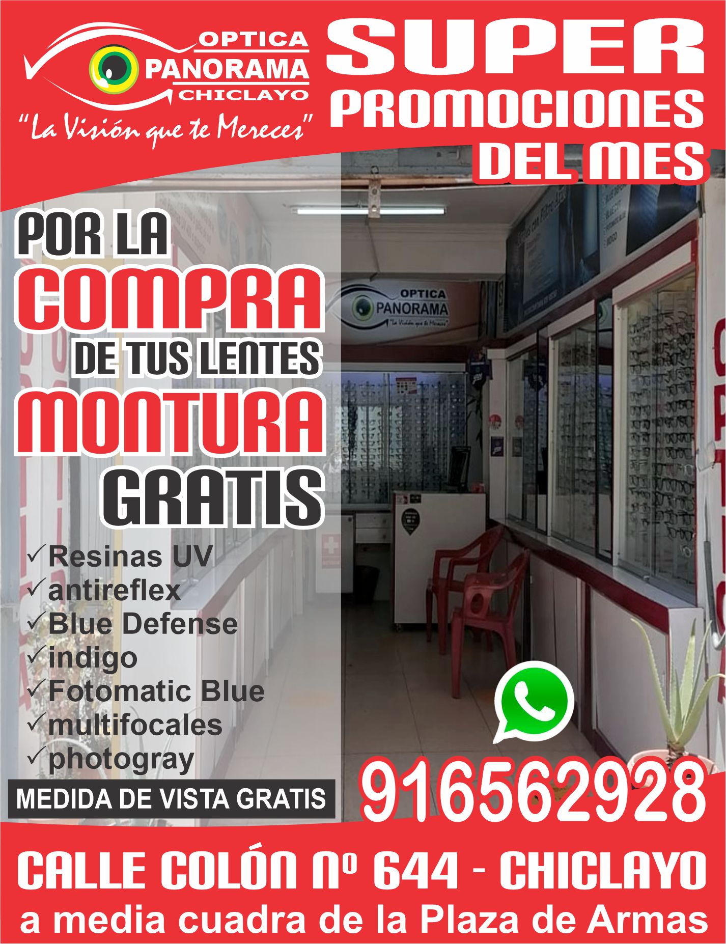 OPTICA PANORAMA CHICLAYO, inició sus actividades el 28 de setiembre del 2009, con 9 años de experiencia en el rubro, con la finalidad de brindar atención de oftalmología, para toda la comunidad lambayecana. En la actualidad con el avance de la tecnología y la aparición de nuevops dispositivos tecnológicos considerados necesarios para nuestra actividad diaria y que reflejan una luz mediante la pantalla, han generado la aparición de nuevas enfermedades que afectan directamente a nuestros ojos. Como empresa brindamos servicios para el cuidado de tus ojos como son medida de la vista computarizada, venta de lentes y monturas de calidad y modelos de acuerdo a las necesidades de cada cliente, con una atención personalizada. Actualmente nos ubicamos en la ciudad de Chiclayo, Calle Colón 644, a media cuadra de la plaza de armas de la ciudad de chiclayo.